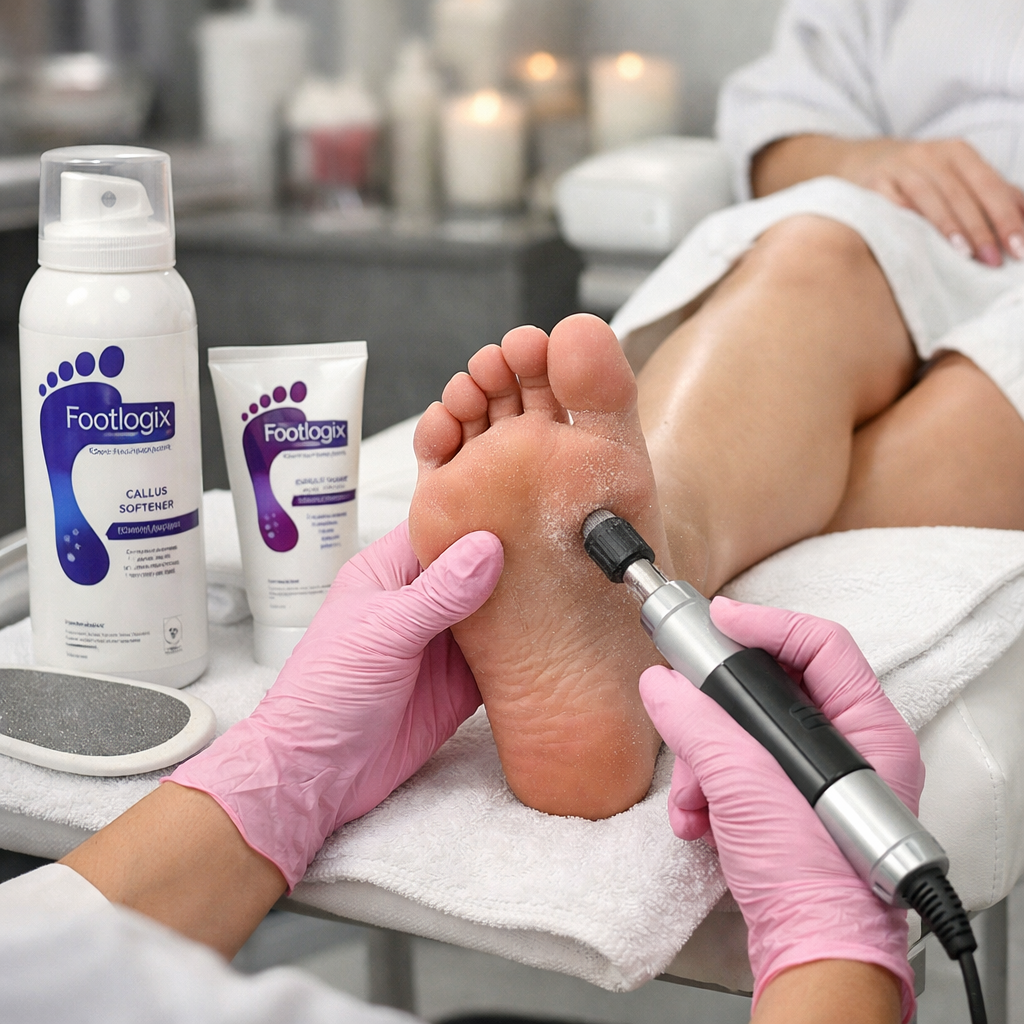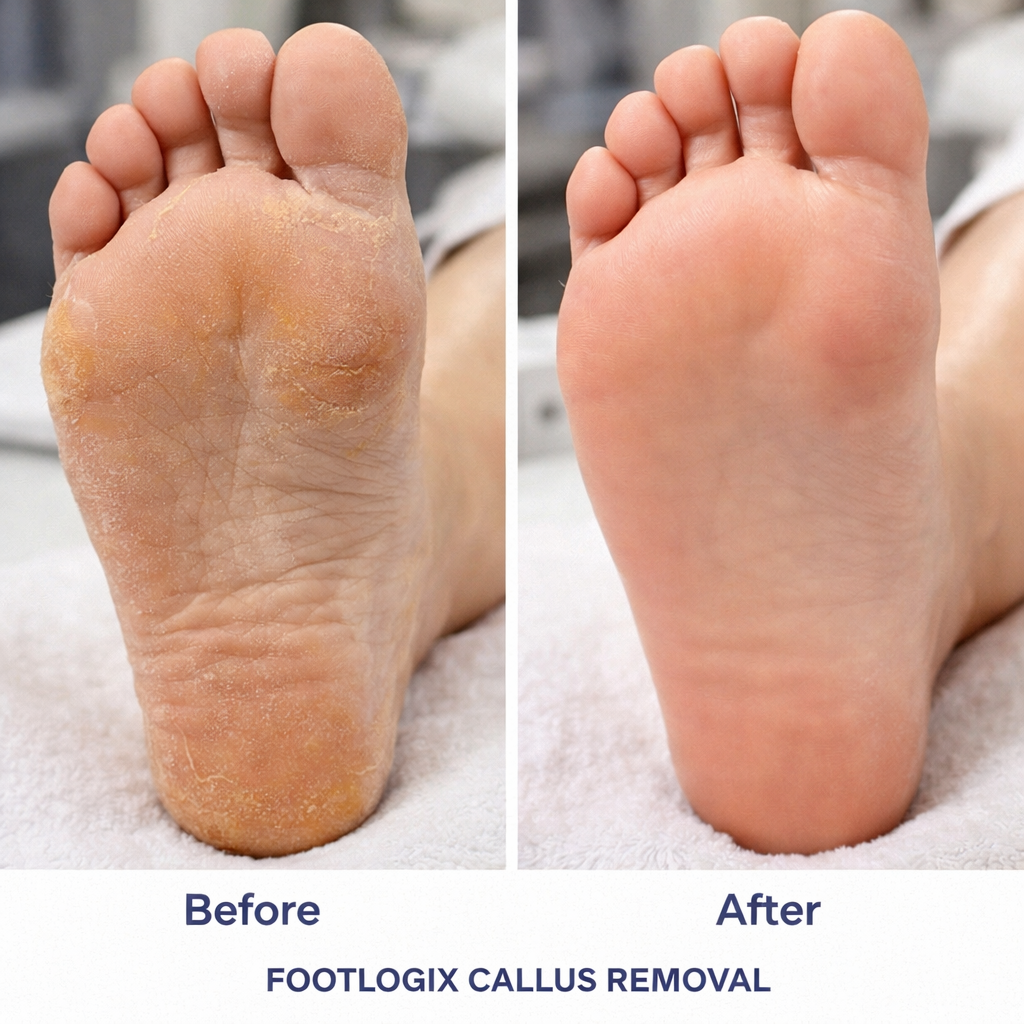 Enjoy a professional footlogix callus removal pedicure designed to treat rough , dry feet with advanced products and techniques . this treatment gentrly removes callus build up while restoring moisture for smooth , healthy looking feet
